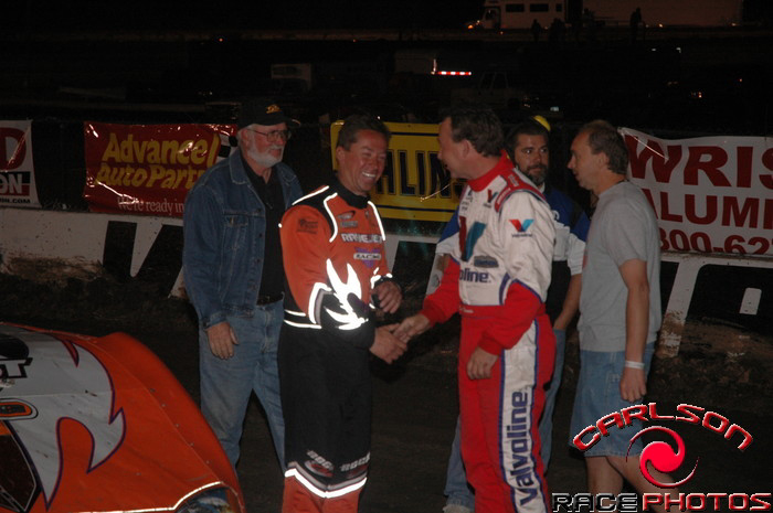Rick congratulates Steve Francis after he won the World of Outlaws Late Model Series event at the Volusia (FL) Speedway Park in February 2006. Rick wound up a close second to Francis! -